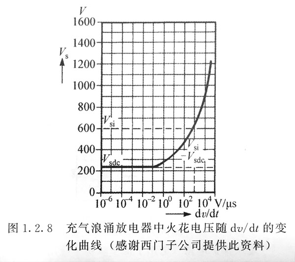 充氣浪涌放電器的一個缺點(diǎn)是其對過壓應(yīng)力的反應(yīng)速度相對慢。等離子體的形成過程是相當(dāng)慢的,而起弧電壓與dv/dt有關(guān)。如圖1.2.8所示,一個典型的270V裝置中起弧電壓是dv/dt的函數(shù),這種效應(yīng)在瞬變尖峰沖擊速率為10V/us時是非常明顯的,因此,對快速瞬變過程來說,充氣浪涌放電器必須有濾波器或快速反應(yīng)的鉗位裝置的支持。
