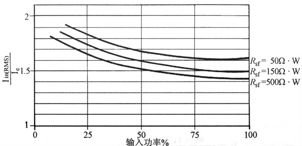 圖清楚地表明即使輸入電壓保持為正弦波,輸入電流也將嚴(yán)重畸變,且具有很大的峰值。畸變的電流波形導(dǎo)致了輸入PR功耗的增加和輸入功率因數(shù)的降低。甚至有一個(gè)很大的紋波電流流入濾波電容。 圖中顯示了輸入電流有效值、電容電流有效值、電容電流峰值這3者與輸入功率、等效電阻值因數(shù)R的關(guān)系,等效電阻值因數(shù)是典型應(yīng)用中的一個(gè)參數(shù)。這些信息在正確確定輸入元件的大小時(shí)是很有用的。