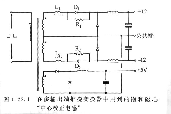 當變換變壓器有多個繞組用來提供輔助輸出電壓時,要獲得正確的輸出電壓有時會出現一些問題。變壓器的繞組只能以一匝為單位進行調整,如第三部分第4章有時可以是半匝,因此變壓器不能利用所有的繞組輸出精確的電壓值。 當采用輸出輔助電源適配器時(通常是三端串聯調節器),副邊輸出電壓誤差通常可以滿足要求。但是在很多場合下輔助電源適配器并沒有附加電壓調節器但又需要能夠對輸出電壓進行中心校正(把輸出電壓設置到一個絕對值上)。 接下來介紹用飽和電抗器的無損耗方法進行電壓調整的電路。