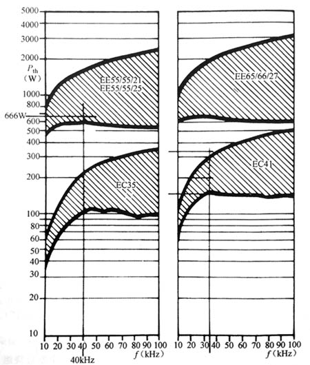 圖平衡推挽工作時(shí)的磁心選擇圖,表示輸出功率是頻率的函數(shù),以磁心尺寸為參數(shù)