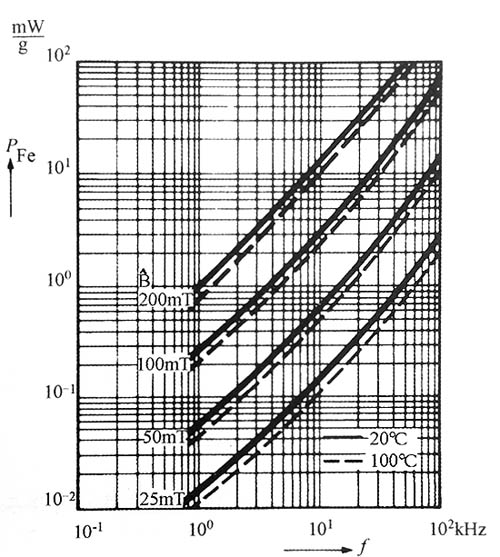 圖每克A16鐵氧體的磁心損耗是頻率的函數(shù),以峰值磁通密度為參數(shù)注:圖中曲線畫的是峰值磁通密度B,磁通密度變化范圍△B是2×B 圖表示一對(duì)工作于40kHz的A16鐵氧體EE55-55-21磁心,隨著匝數(shù)的變化其磁心損耗、銅損耗和總損耗的變化情況,峰值磁通密增加到了200mT。較小的總損耗產(chǎn)生在70mT附近。(對(duì)于每匝繞組,假設(shè)使用了較佳的磁心窗口面積和導(dǎo)線規(guī)格。)