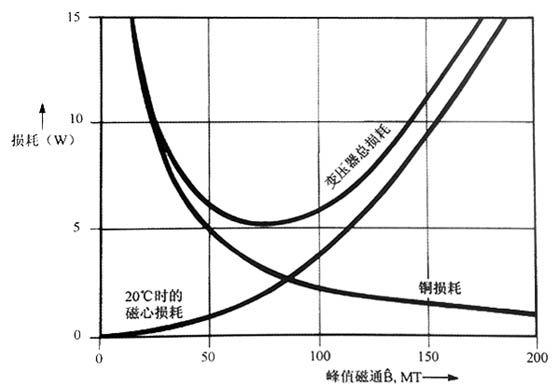 圖典型開關(guān)式變壓器在具有較佳繞制性能時(shí),一對(duì)A16鐵氧體EE55-55-21磁心的磁心損耗,銅損耗和總損耗。損耗是峰值磁通密度的函數(shù)。注意到當(dāng)變壓器電感(匝數(shù))為較佳時(shí)出現(xiàn)較小總損耗,此時(shí)磁心損耗是總損耗的44%