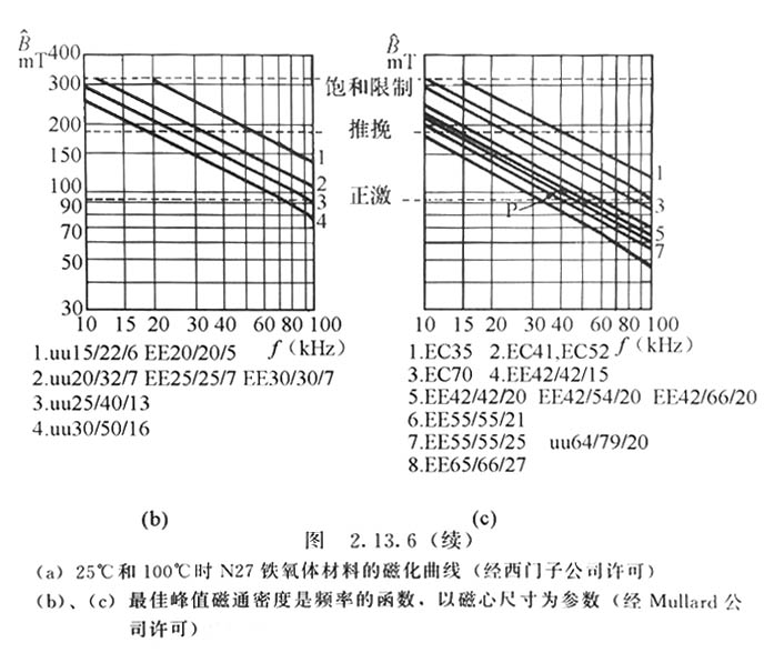 (a)25℃和100℃時(shí)N27鐵氧體材料的磁化曲線(經(jīng)西門子公司許可) (b)、(c)較佳峰值磁通密度是頻率的函數(shù),以磁心尺寸為參數(shù)