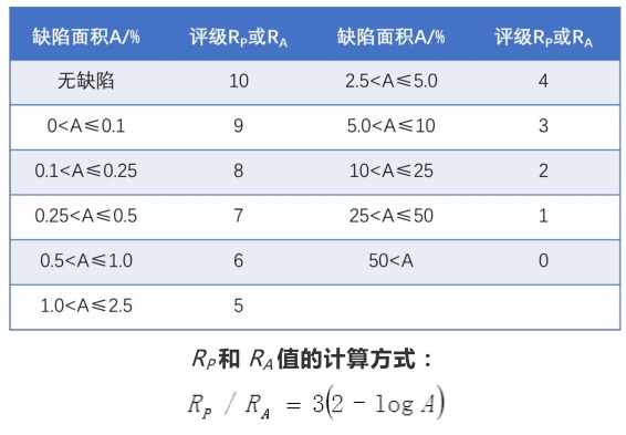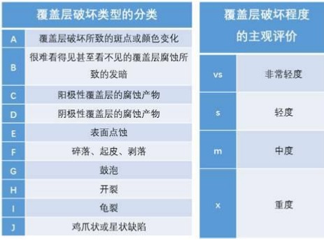 RP—保護評級值; RA—外觀評級值; A—計算RP時,為基體金屬腐蝕部分占總面積的百分比;計算RA時,為保護層腐蝕部分占總面積的百分比。 覆蓋層分類及主觀評價 保護評級的表示方法為:RA/— 如:輕微生銹超過表面1%,小于表面2.5%時,表示為:5/ — 外觀評級的表示方法為:—/RA值+主觀評價+覆蓋層破壞等級 如:中度起斑點,面積超過20%,表示為:—/2mA性能評級的表示方法為:RA值+主觀評價+覆蓋層破壞等級如:試樣未出現基體金屬腐蝕,但出現小于總面積的1%的陽極性覆蓋層的輕度腐蝕,表示為10/6sC