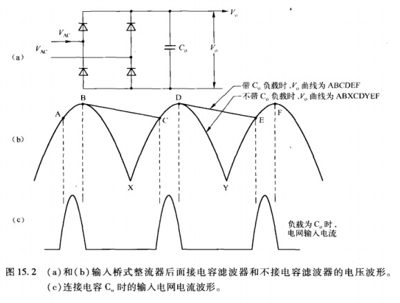 像ABXCDYER圖這樣的正弦半波輸出電壓在許多場合是不可用的。整流器的目的是將輸入交流電壓變換成紋波盡可能小的直流電壓,正因為如此,才接入串容C。來產生波形 ABCDEF。這樣可以產生較高的直流電壓分量(在B和C或D和E的中間)和較低的B-C或C-D的峰一峰值紋波。在B和C或D和E之間,所有整流器二極管都被反偏,沒有電網電流流過,負載電流由電容C提供。在A、C和E時刻,上升的輸入電壓使整流器二極管正向導通,電網電流流過負載并給電容充電,補償其單獨給負載供電時損失的電荷。