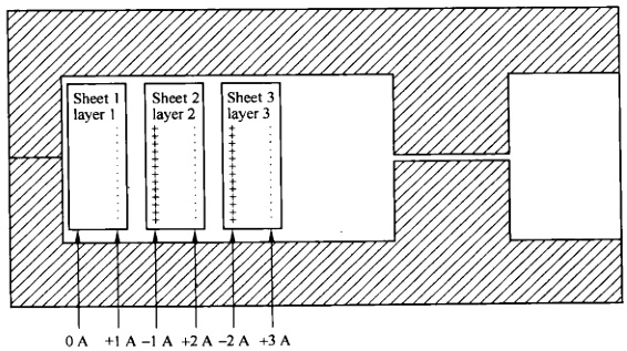 如果沿閉環cgh(穿過薄片1和2的中心)對Hd進行積分,由于該平面上的磁場強度為零,根據安培定則,該平面上包圍的電流也為零。既然流過薄片1右側面的電流為1A(沿“+”號方向),那么流過薄片2左側面的電流必定也為1A,方向以“-”號(或“x”號)表示。