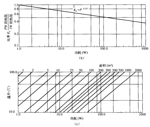 | 變壓器的溫升(相對于環(huán)境溫度)取決于磁心損耗和線圈損耗(即銅損)之和,另外還與輻射表面的大小有關(guān)。氣流流經(jīng)變壓器可以減小變壓器溫升,降低的程度與氣流速度(立方英尺每分鐘)有關(guān)。 要想精確、系統(tǒng)地計算出變壓器的溫升是不現(xiàn)實的,但是基于熱阻這一概念可以得到一些經(jīng)驗曲線,估算出來的溫升誤差一般在10℃以內(nèi)。散熱片的熱阻R定義為散熱片每耗散一瓦功率所帶來的溫升(通常以℃為單位),溫升的增加dT與功率損耗P之間的關(guān)系為:dT=PR1。 提示:根據(jù)參考文獻18,利用變壓器總的損耗(磁心損耗以及銅損之和),變壓器有效散熱面積的相關(guān)信息以及散熱方式有可能比較精確地計算出變壓器溫升。 一些適配器廠家直銷磁心廠家還給出了不同產(chǎn)品的R值,指出磁心表面的溫升為R1與磁心損耗和銅損之和的乘積。有經(jīng)驗的用戶通常假定變壓器內(nèi)部較熱點(一般位于磁心中心柱)的溫升比磁心外表面高10~15℃。 溫升不僅和輻射表面積大小有關(guān),還與變壓器總的功率損耗有關(guān)。輻射表面所耗散的功率越大,輻射表面和周圍空氣的溫差就越大,表面更容易冷卻,也就是說表面的熱阻越低。 因此,在估算變壓器溫升時,往往將變壓器總的外表面積等效成散熱片的輻射表面積總的外表面積為(2x寬度x高度+2×寬度x厚度+2×高度x厚度)。等效散熱片的熱阻可以根據(jù)總的功率損耗(磁心損耗與銅損之和)來校正。 散熱片熱阻與表面積的關(guān)系曲線如圖7。4(a)所示,這是一條經(jīng)驗曲線,是根據(jù)大量不同廠家生產(chǎn)的不同尺寸和形狀的散熱片的平均值得來的。圖中曲線對應(yīng)于1W功率級的熱阻值,在雙對數(shù)坐標(biāo)中表現(xiàn)為一條直線。 盡管片狀散熱器的熱阻在某種程度上與葉片的形狀、葉片間的空隙和葉片是否黑化或鍍鋁有關(guān),但這些都只是次要因素。在某種程度上,可以說熱阻完全由散熱片輻射表面的面積決定。 不同散熱器廠家的產(chǎn)品目錄中也會給出如圖7。4(b)所示的熱阻與功率損耗關(guān)系的經(jīng)驗曲線。