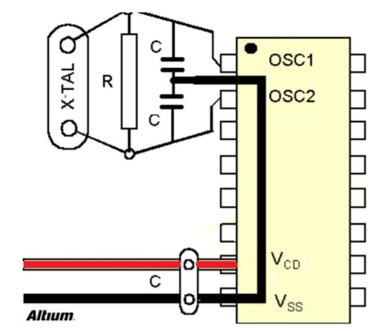 在微控制器(MCU)為主的系統中較敏感的信號是時序、復位和中斷信號。振蕩器在開關時尤其敏感。這些電路與高電流走線不能平行,以免引起信號干擾和誤判。振蕩器或陶瓷共振時鐘是一種射頻電路,必須有效布局為距離較近,走線較短以減少其敏感性。下圖以DIP封裝的振蕩器或陶瓷共振器為例,應盡量將振蕩電路靠近微控制器布局,位置對稱,使得走線距離較短。振蕩電路的地線應該連接元件可能使用較短路徑的接地管腳,電源適配器和接地管腳應該直接連接到PCB的電源適配器部分。