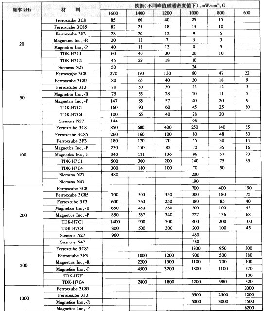 | 大家希望了解關于電源適配器設計的要求來選擇較合適的拓撲,可以在前面文章查看。通常設計電源適配器選擇電路拓撲時較需要考慮的是高網壓時功率開關管承受的關斷電壓應力較小,而輸出較大功率時過開關管的峰值電流較小。其他需要考慮的還有減少元器件數量、電源適配器成本以及整機體積。另外,如何減小射頻干擾也是在選擇拓撲和開關頻率時需要考慮的一個因素。 電源適配器電路拓撲選定以后,就要確定電路的工作頻率和電源適配器變壓器磁心尺寸,確保在電源適配器變壓器體積較小的情況下獲得所需要的較大輸出功率。要確定頻率和電源適配器變壓器磁心尺寸,首先要知道輸出功率和電源適配器變壓器各種參數之間的關系,如電源適配器變壓器體積、磁心窗口面積、骨架繞線面積、峰值磁通密度、工作頻率以及線圈電流密度等。下面的章節將對較常用的幾種電路拓撲的這些關系進行推導,并給出計算公式。 上面所提到的這些關系可以寫成公式的形式,根據這些公式可以選擇電源適配器變壓器磁心和工作頓率。一種方法是首先估算出所需磁心的大小和工作頻率,然后根據所選磁心、頻率以及相關參數計算出近似功率。如果這個功率不符合要求,就必須更改先前的假設,重新設定電源適配器變壓器尺寸和工作頻率,重復以上過程。由于這些參數彼此相關,所以必須經過大量計算才能得到滿足要求的電源適配器變壓器尺寸和工作頻率。 另外一種更好的方法就是將公式轉化為圖表。圖表中縱坐標參量為工作頻率(每&kHz一格),橫坐標參量為不同廠家生產的磁心參數,根據公式計算,縱軸與橫軸的交點就是在這些參數下的輸出功率。 沿著橫軸方向,輸出功率不斷增加。這樣由圖表就能很容易的選定工作頻率。只要沿著該頻率所在行向右查找,找到的第一個滿足功率要求的磁心即為所求。或者若滿足尺寸要求的磁心已經選定,那么只要沿著該磁心所在的列向上查找,第一個滿足輸出功率要求的頻率就是所需要的頻率。 目前較常用的幾家電源適配器廠商生產的不同磁心材料的磁心損耗隨頻率和峰值磁通密度變化的特性,討論了現有的鐵氧體磁心的幾何結構以及各自的應用場合。也提供了鐵損和銅損的計算方法,并對產生銅損的主要因素一鄰近效應進行了闡述。較后還論證了電源適配器變壓器溫升與磁心損耗和銅損的關系。 品字尾電源適配器變壓器磁心材料與幾何結構、峰值磁通密度的選擇 幾種常用鐵氧體材料的磁心損耗與頻率和磁通密度的關系 大多數開關電源適配器的變壓器都采用鐵氧體磁心。鐵氧體是一種具有晶體結構的陶瓷性鐵磁材料,一般由氧化鐵和錳或鋅氧化物混合構成。因為它有很高的電阻率,所以鐵氧體的渦流損耗可以忽略。有些鐵氧體材料的磁心損耗主要來自磁滯損耗,如果磁滯損耗足夠小,則這種材料可以用在1MHz以上開關頻率的場合。目前市面上常用的鐵氧體磁心主要來自幾大廠家,如美國的 Ferroxcube- Philips、 Magnetics Inc。、 Ceramie Magnetics Inc。、 Ferrite International、Fairrite,以及其他國家的生產廠家如TDK、 sIemens、 Thomson-CSF、 Tokin等。 每個廠家都生產了一系列不同材料的磁心,采用不同的生產工藝可以得到不同優點的產品。有的磁心材料可以使工作在高頻(>100kH)時的磁心損耗較小,有的可以使在高溫下(如90°C)磁心損耗較小,還有的可以使在常用的高頻和峰值磁通密度條件下的磁心損耗較小。但是,大多數廠家適用于功率電源適配器變壓器的鐵氧體的直流磁滯回線都是相似的。當溫度為100°C時,它們都在3000G到3200G的范圍內達到10%的飽和度,矯頑力在0.10~0.150e之間,剩余磁通密度約為900~1200G。 選擇磁心材料的主要參考因素為磁心損耗(單位一般為mW/cm3)隨頻率和峰值磁密變化的曲線。以 Ferroxcube-Phip生產的3B3型磁心為例,圖7。1給出了其磁心損耗曲線和直流磁化曲線。表列出了一些常用材料的磁心損耗值。 盡管沒有特別說明,表中這些由磁心廠家提供的數據一般都是針對雙極性磁路即磁通變化工作在磁滯回線一、三象限的電路(如推挽、半橋和全橋)而言的,而正激變換器和反激變換器僅工作在第一象限。 由于鐵氧體的磁心損耗僅為磁滯損耗,而磁滯損耗又與磁滯回線所包含的面積成正比,因此可以想象,如果電路的磁場是單極性的,磁滯回線面積僅為雙極性磁場的一半,那么在相同的峰值磁通密度下,磁心損耗僅為雙極性電路的一半。 關于這一點,生產商之間還存在不少的爭議。有的廠家認為在同樣的峰值磁通密度下,單極性電路的磁心損耗只有雙極性電路的1/4,他們認為單極性電路的磁通密度從零變化到較大磁通密度B_時,相當于雙極性電路的磁通密度從較小值(-B2)變化到較大值(B/2)。而雙極性電路中磁心損耗與峰值磁通密度變化的平方成正比,那么有著相同峰值磁通密度變化的單極性電路的磁心損耗應為雙極性電路的1/4。 TDK提供的曲線顯示,一個單極性電路磁通密度從零變化到B_時的磁心損耗與雙極性電路的磁通密度從一B到+B=時的磁心損耗呈K倍關系。其中參數因子K與頻率有關0kHz時為0.39,60kHz時為0.35,100kHz時為0.34。 磁滯回線面積只有雙極性電路的一半(對單極性電路而言),那么其磁心損耗也應減半這個觀點雖仍有爭議但還是被大部分人所接受。這么看來,在峰值磁通密度相同的情況下表中所列單極性電路的損耗應