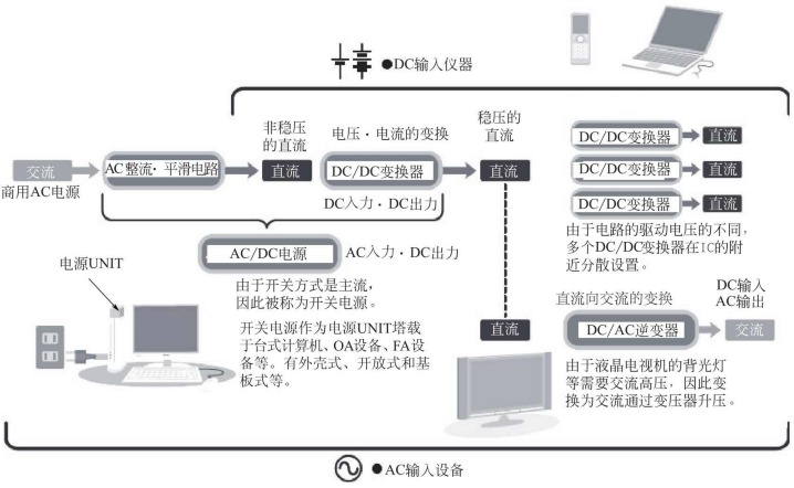 ![]() AC/DC功率模塊是將AC/DC變換器和DC/DC變換器緊湊地一體化,采用不需要冷卻風(fēng)扇的傳導(dǎo)散熱方式。AC/DC功率模塊的輸出功率:300~1000W,AC/DC功率模塊產(chǎn)品類型如圖所示。 ![]() ②DC/DC變換器。在通信系統(tǒng)中也稱DC/DC變換器為二次電源適配器,它是由一次電源適配器或直流電池組提供一個(gè)直流輸入電壓,經(jīng)DC/DC變換以后在輸出端獲得一種或幾種直流輸出電壓。DC/DC變換器產(chǎn)品類型如圖所示。 ![]() 絕緣型DC/DC變換器使用變壓器絕緣,有防止觸電的優(yōu)點(diǎn),但是小型化、低價(jià)格化有困難。非絕緣型DC/DC變換器未使用變壓器絕緣,但具有小型、低價(jià)格等優(yōu)點(diǎn)。 DC/DC功率模塊以通信儀器使用的磚型變換器為代表,采用傳導(dǎo)散熱方式,DC/DC功率模塊產(chǎn)品類型如圖所示。 ![]() ③DC/AC逆變器。DC/AC逆變器將直流轉(zhuǎn)換為需要的交流,DC/AC逆變器產(chǎn)品類型如圖所示。 ![]() 隨著科學(xué)技術(shù)的飛速發(fā)展,對(duì)開(kāi)關(guān)電源適配器的可靠性、容量體積比要求越來(lái)越高,開(kāi)關(guān)電源適配器模塊越來(lái)越顯示出其優(yōu)越性,它工作頻率高、體積小、可靠性高,便于安裝和組合擴(kuò)容,所以被廣泛采用。目前,國(guó)內(nèi)雖有相應(yīng)開(kāi)關(guān)電源適配器模塊生產(chǎn),但電源適配器研發(fā)制造廠商生產(chǎn)工藝未能趕上國(guó)際水平,故障率相對(duì)較高。目前開(kāi)關(guān)電源適配器模塊的成本雖然較高,但從產(chǎn)品應(yīng)用周期的整體成本來(lái)看,特別是因系統(tǒng)故障而導(dǎo)致的高昂的維修成本及商譽(yù)損失來(lái)看,選用開(kāi)關(guān)電源適配器模塊是具有高性價(jià)比的。 (2)開(kāi)關(guān)電源適配器按工業(yè)和民用分類 幾乎全部需要穩(wěn)壓直流電源適配器的電子儀器和電子設(shè)備都可使用開(kāi)關(guān)電源適配器,電子儀器內(nèi)使用的各種電源適配器如圖所示。開(kāi)關(guān)電源適配器按工業(yè)和民用可分為以下兩種。