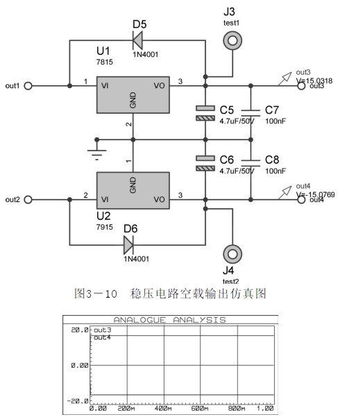 三端穩壓器選擇7815、7915,在輸出端同時并入二極管D5、D6(型號為1N4001),當三端穩壓器未接入輸入電壓時可保護其不至于損壞。輸出端out3、out4分別可輸出+15V與-15V電壓,并驅動LED發光,穩壓電路空載輸出仿真圖如圖所示。