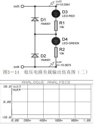 穩壓器7815、7915輸出端out3、out4處接入10kΩ電阻與LED負載測試,仿真結果如圖所示。穩壓電路輸出為兩個穩定的±15V電壓,輸出仿真結果如圖所示。