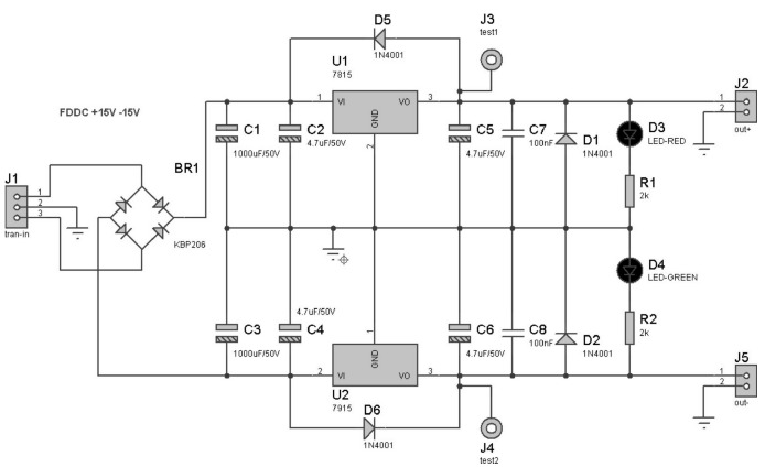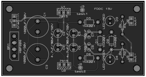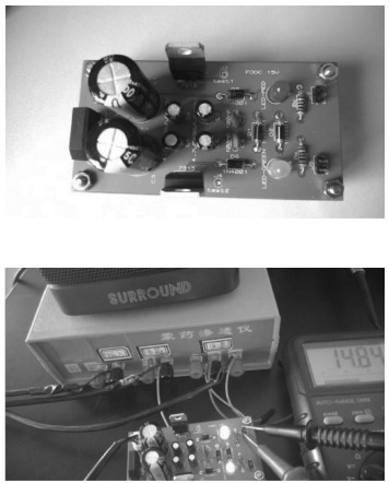 對電路板進行實際測試,測試正電壓輸出為14.84V,負電壓輸出為-14.77V,設計要求輸出雙電源適配器±15V電壓,實測基本符合設計要求。