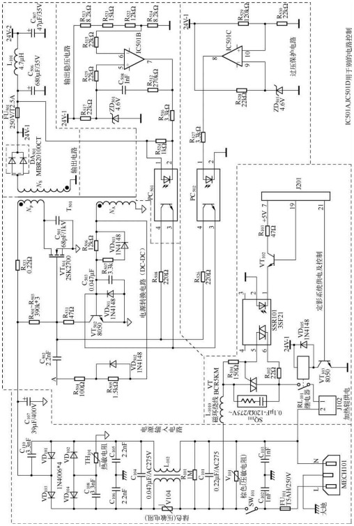 該機是由功率管VT501(2SK2700是MOSFET)和開關變壓器T501為核心構成的自激式電源適配器。