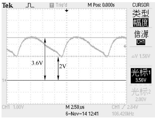 圖為某負載時以A點為參考零電位時測得的功率管柵極(G)電壓波形。可見,柵極電位(G)始終高于A點電位,振幅約為1.6V。
