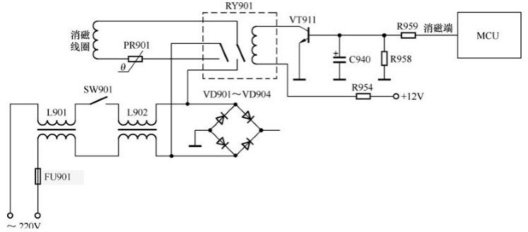| 電源適配器在高電壓下,較大功率的電源適配器同時也工作在大電流狀態(tài)下,并且受到浪涌電流和高壓脈沖的威脅,加之電源適配器電路復(fù)雜,因此,電源適配器除了一般電子線路外,還要設(shè)置多種特殊保護(hù)電路,以此保證電源適配器穩(wěn)定工作。 消磁電路 地磁和外部磁場會影響一些電器的正常工作,因此,一些特殊的電器,如CRT彩電、CRT顯示器等,其電源適配器中會設(shè)有消磁電路。 消磁電路的主要元件是消磁電阻,消磁電阻是一種正溫度系數(shù)(PTC)的熱敏電阻,用于對顯像管的消磁。其阻值能隨溫度升高而迅速增大。利用PTC熱敏電阻充當(dāng)消磁元件,具有節(jié)能、安全、方便、低成本的特點。 地磁和外界各種雜散磁場對彩色顯像管有磁化作用,顯像管的蔭罩、柵網(wǎng)、防爆環(huán)、外屏蔽罩和固定件極容易被磁化。磁化的結(jié)果將改變電子束軌跡,使色純不良,并引起會聚誤差,有時甚至使屏幕上出現(xiàn)明顯的色斑。為了克服地磁場、周圍雜散磁場以及機(jī)內(nèi)金屬零部件形成的磁場對顯像管內(nèi)電子束的影響,設(shè)有一套消磁電路。該電路在每次開機(jī)時,產(chǎn)生一個由強(qiáng)變?nèi)醯慕蛔兇艌觯瑢︼@像管金屬部件進(jìn)行消磁。 消磁電路主要有常規(guī)消磁電路和MCU控制消磁電路兩種,下面分別進(jìn)行介紹。 1.常規(guī)消磁電路 常規(guī)消磁電路由PTC熱敏電阻和消磁線圈構(gòu)成。圖是常規(guī)消磁電路原理圖。 ![]() 將消磁電阻、消磁線圈串聯(lián)后裝在顯像管防爆帶附近,開機(jī)通過高達(dá)20A的起始電流而迅速發(fā)熱,并使其自身阻值突變增高,30s后的殘余電流值降低至10mA以下,使消磁電路產(chǎn)生一個逐漸衰減的交變強(qiáng)磁場,達(dá)到消除熒屏剩磁的目的。 2.MCU控制消磁電路 MCU(微控制器)控制消磁電路是一種新式消磁電路,它是在常規(guī)消磁電路的基礎(chǔ)上增加了一個消磁控制電路,該控制電路工作時間由MCU單獨設(shè)置的控制端子進(jìn)行控制。圖2-15所示為MCU控制消磁電路原理圖。 ![]() 圖MCU控制消磁電路原理圖 在接通電源適配器開關(guān)后,MCU進(jìn)入工作狀態(tài),其消磁控制端輸出高電平消磁信號,三極管VT911導(dǎo)通,繼電器線圈得電,繼電器常開觸點閉合,將消磁電阻、消磁線圈接入市電回路中,于是,市電電壓經(jīng)消磁電阻限流,在消磁線圈中產(chǎn)生交變磁場,對顯像管及其附件進(jìn)行消磁。數(shù)秒后,MCU消磁控制端為低電平,控制電路停止工作,使消磁回路被切斷。這樣不但降低了消磁電阻的故障率,而且提高了消磁電路的工作效率。