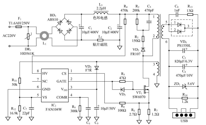 圖為USB手機(jī)充電器電路原理圖,采用Fairchild公司出品的一次繞組反饋(PSR(3))控制器FAN104W。 ![]() 變莊器上的一繞組線,通過這個繞組上的電壓、電流變化確定電路的工作情況,從而來調(diào)整電路的工作穩(wěn)定。一次繞組反饋(PSR)與傳統(tǒng)二次繞組反饋光耦和TL431的結(jié)構(gòu)相比,節(jié)約了電路板上的空間,降低了成本。在省去了光耦和TL431等元器件之后,為了實(shí)現(xiàn)高精度的恒流/恒壓(CC/CV)控制特性,必然要采用新的技術(shù)來監(jiān)控負(fù)載、電源和溫度的實(shí)時變化及元器件的同批次容差,這就涉及一次繞組調(diào)節(jié)技術(shù)、變壓器容差補(bǔ)償、線纜補(bǔ)償和EMI優(yōu)化技術(shù)。 (1)高壓啟動 市電經(jīng)F1(延時保險絲)輸入,經(jīng)DR1(綠色壓敏電阻)過壓保護(hù)和共模扼流圈L1送給DB1進(jìn)行全波整流。高壓電容C1、C2與電感L3構(gòu)成π形濾波電路,貼片磁阻L2用于濾除差模干擾。直流母線通過電阻R4(推薦值為100kΩ)連接至FAN104的8腳(HV)。初始上電時,內(nèi)部高壓電流源開啟,為HV引腳提供輸入電流IHV,對電源端VDD外接電容C9充電。當(dāng)VDD電壓達(dá)到IC開啟電壓VDD-ON時,內(nèi)部高壓電流源被禁用,阻止IHV流入HV引腳。 IC開啟后(在PWM輸出之前),C9是提供IC消耗電流的電能來源。因此,C9必須足夠大(推薦值為22μF),以便在輔助繞組輸出電壓之前阻止VDD降至IC關(guān)斷電壓VDD-OFF。正常工作時,由輔助繞組經(jīng)VD6、C9整流濾波給FAN104供電。 (2)FAN104W引腳功能 該高度集成的PWM控制器FAN104W具備多種功能,可增強(qiáng)低功率反激轉(zhuǎn)換器的性能。FAN104W專有的拓?fù)浣Y(jié)構(gòu)簡化了電池充電器應(yīng)用中的電路設(shè)計。與常規(guī)設(shè)計或線性變壓器相比,這樣的充電器具有更低的成本、更加小型化,也更加輕便。FAN104W各引腳功能說明見表。 表FAN104W各引腳功能說明
