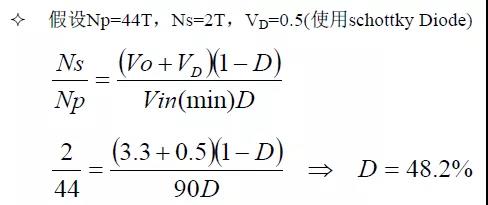 2)決定一次側(cè)濾波電容: 濾波電容的決定,可以決定電容器上的Vin(min),濾波電容越大,Vin(win)越高,可以做較大瓦數(shù)的Power,但相對(duì)價(jià)格亦較高。 3)決定變壓器線徑及線數(shù): 當(dāng)變壓器決定后,變壓器的Bobbin即可決定,依據(jù)Bobbin的槽寬,可決定變壓器的線徑及線數(shù),亦可計(jì)算出線徑的電流密度,電流密度一般以6A/mm2為參考,電流密度對(duì)變壓器的設(shè)計(jì)而言,只能當(dāng)做參考值,后面應(yīng)以溫升記錄為準(zhǔn)。 4)決定Duty cycle(工作周期): 由以下公式可決定Duty cycle ,Duty cycle的設(shè)計(jì)一般以50%為基準(zhǔn),Duty cycle若超過50%易導(dǎo)致振蕩的發(fā)生。