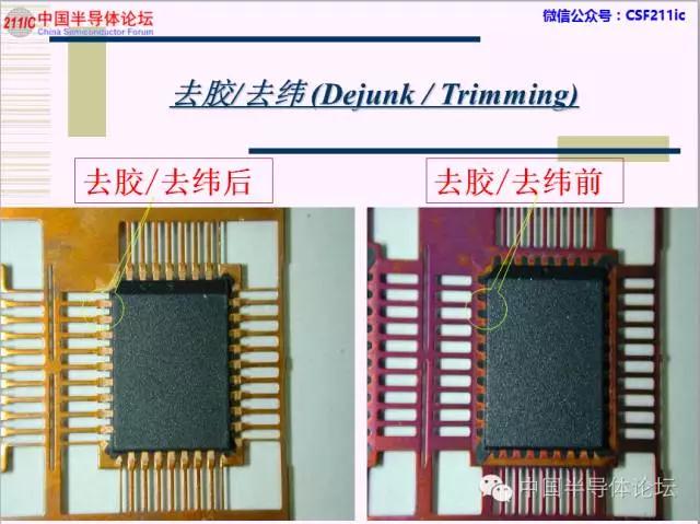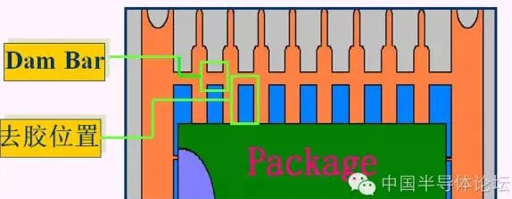 去膠(Dejunk)的目的:所謂去膠,是指利用機械模具將腳尖的費膠去除;亦即利用沖壓的刀具(Punch)去除掉介于膠體(Package)與(Dam Bar)之間的多余的溢膠。