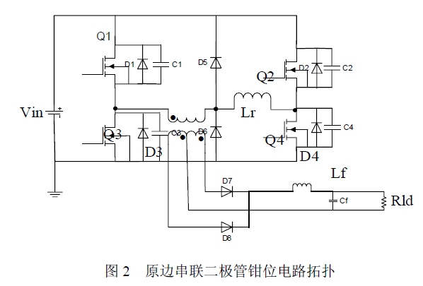在實(shí)現(xiàn)滯后橋臂的同時(shí),為了進(jìn)一步擴(kuò)大負(fù)載范圍,可在原邊上再串聯(lián)上一飽和電感,該電路可減小占空比的損失和減小變壓器副邊的寄生振蕩,但是飽和電感工作在正、負(fù)飽和值之間,而且頻率很高,使得飽和電感的損耗較大,在低的輸入電壓情況下會(huì)引起較為嚴(yán)重的副邊占空比丟失。 2.2 原邊串聯(lián)二極管鉗位電路及其改進(jìn)電路 上述電路雖然實(shí)現(xiàn)了全橋移相電路的ZVS,但是并沒有很好地解決輸出整流二級(jí)管在反向恢復(fù)過程中的電壓尖峰問題,基于此有文章提出了鉗位電路(如圖2)