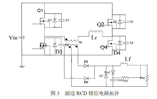 該電路在變壓器原邊增加一個(gè)諧振電感和兩個(gè)鉗位二級(jí)管,消除了輸出整流管上的電壓尖峰和電壓振蕩,從而省去了吸收電路,可以選擇低壓的整流管,該電路的主要缺點(diǎn)是: 1)在原邊電壓為0 時(shí),諧振電感被鉗位二極管短路,其電流保持不變,在電感鉗位二極管和開關(guān)管中產(chǎn)生較大的導(dǎo)通損耗; 2)增加了鉗位二極管的電流有效值和關(guān)斷損耗; 3)為了防止直流偏磁,一般采用隔直電容與變壓器或諧振電感串聯(lián),但隔直電容上的直流分量會(huì)導(dǎo)致變壓器原邊電流或諧振電感電流不對(duì)稱,影響變換器的可靠工作。 上述電路的拓?fù)涓倪M(jìn),把諧振電感和變壓器互換位置,使鉗位二極管在一個(gè)周期內(nèi)只導(dǎo)通1 次,降低了鉗位二極管有效值,降低了導(dǎo)通損耗,進(jìn)一步提高了變換器效率。 2.3 副邊RCD 鉗位電路拓?fù)? 圖2 及其改進(jìn)拓?fù)湔呤窃谠吋鱼Q位二極管。另一種方法是在副邊加鉗位電路。圖3就是一改進(jìn)的副邊RCD 鉗位電路拓?fù)洌撾娐纺苡行б种聘边吂艿碾妷哼^沖,同時(shí)導(dǎo)通損耗也較低,主要缺點(diǎn)是吸收電路損耗大,降低了變換器的效率。