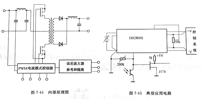 2內(nèi)部結(jié)構(gòu)及應(yīng)用電路 DB2800S系列的內(nèi)部結(jié)構(gòu)框圖如圖7-44所示。 圖7-45顯示了該電路的遙控特點:減小了由于輸入給負(fù)載的導(dǎo)線電阻而引起的輸出誤差,也給出了非同步操作連接及輸出電壓微調(diào)、遙控關(guān)斷、錯誤檢測、輸入電壓接通點調(diào)整電路。 ![]()