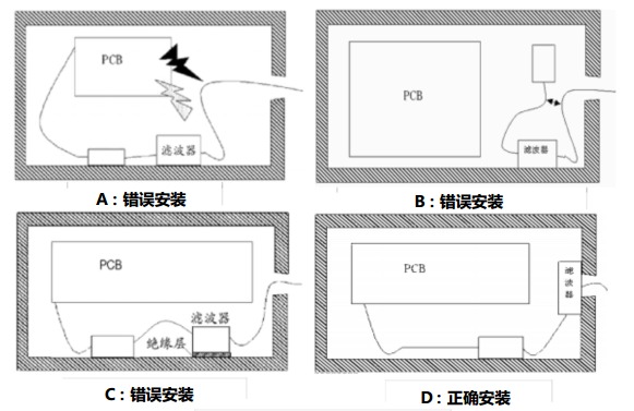 無論是對電源端子、 負載端子和附加端子采取抑制措施, 若使用獨立的濾波器時, 需注意其安裝方