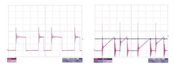 圖 2 顯示了電流斜坡存在的一些問 題。第一幅圖顯示了上升邊沿峰值和隨后 產生的電流斜坡。比較器(根據其不同速度) 具 有 兩 個 電 壓 結 點 (potential trip points),結果是無序控制運行,聽起來更 像是煎熏肉的聲音。