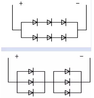 串并混聯方式 在需要使用比較多LED的產品中,如果將所有LED串聯,將需要LED驅動器輸出較高的電壓。如果將所有LED并聯,則需要LED驅動器輸出較大的電流。 將所有LED串聯或并聯,不但限制著LED的使用量,而且并聯LED負載電流較大,驅動器的成本也會大增。解決辦法是采用混聯方式。串并聯的LED數量平均分配,分配在一串LED上的電壓相同,通過同一串每顆LED上的電流也基本相同,LED亮度一致。同時通過每串LED的電流也相近。 當某一串聯LED上有一顆品質不良短路時,不管采用恒壓式驅動還是恒流式驅動,這串LED相當于少了一顆LED,通過這串LED的電流將大增,很容易就會 損壞這串LED。大電流通過損壞的這串LED后,由于通過的電流較大,多表現為斷路。斷開一串LED后,如果采用恒壓式驅動,驅動器輸出電流將減小,而不 影響余下所有LED正常工作。如果是采用恒流式LED驅動,由于驅動器輸出電流保持不變,分配在余下LED電流將增大,導致容易損壞所有LED。解決辦法是盡量多并聯LED,當斷開某一顆LED時,分配在余下LED電流不大,不至于影響余下LED正常工作。 混聯方式還有另一種接法,即是將LED平均分配后,分組并聯,再將每組串聯一起。 當有一顆LED品質不良短路時,不管采用恒壓式驅動還是恒流式驅動,并聯在這一路的LED將全部不亮,如果是采用恒流式LED驅動,由于驅動器輸出電流保持不變,除了并聯在短路LED的這一并聯支路外,其余的LED正常工作。假設并聯的LED數量較多,驅動器的驅動電流較大,通過這顆短路的LED電流將增大,大電流通過這顆短路的LED后,很容易就變成斷路。由于并聯的LED較多,斷開一顆LED的這一并聯支路,平均分配電流不大,依然可以正常工作,哪么 整個LED燈,僅有一顆LED不亮。 如果采用恒壓式驅動,LED品質不良短路瞬間,負載相當少并聯一路LED,加在其余LED上的電壓增高,驅動器輸出電流將大增,極有可能立刻損壞所有 LED,幸運的話,只將這顆短路的LED燒成斷路,驅動器輸出電流將恢復正常,由于并聯的LED較多,斷開一顆LED的這一并聯支路,平均分配電流不大, 依然可以正常工作,哪么整個LED燈,也僅有一顆LED不亮. 通過對以上分析可知,驅動器與負載LED串并聯方式搭配選擇是非常重要的,恒流式驅動功率型LED是不適合采用并聯負載的,同樣的,恒壓式LED驅動器不適合選用串聯負載。