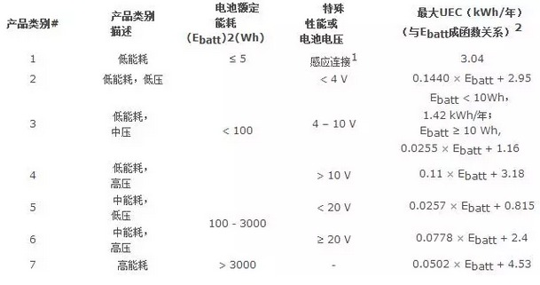根據充電電池的容量及電壓,DOE 能效法規將電池充電器劃分為7種不同類別,并制定出相應電池充電器的單位能量消耗(UEC)限值要求,即電池充電器的年能源消耗量。電池充電器的單位能量消耗(UEC)是以電池能量(Ebatt) 的函數公式,它反映的是電池充電器在所有工作模式下所消耗的無用能量(即,充電過程中所消耗的但未傳輸至電池的能量)。