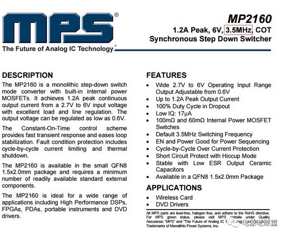 | 中小功率場(chǎng)合,我理解為0-10kW, 高頻理解為1-3Mhz。電源適配器廠家玖琪實(shí)業(yè)在研究超高頻20Mhz的開(kāi)關(guān)電路,但是由于功率僅局限于20W之內(nèi),所以不再討論的話題之內(nèi)(真實(shí)原因是我不懂,哈哈)。 電源適配器廠家對(duì)于將頻率提升特別謹(jǐn)慎,在高頻狀態(tài)下,寄生參數(shù)帶來(lái)的不確定性尤其難以預(yù)測(cè),以下是美國(guó)MPS的MP2160,其頻率高達(dá)3.5M,堪稱DC-DC領(lǐng)域的跑車(chē)。