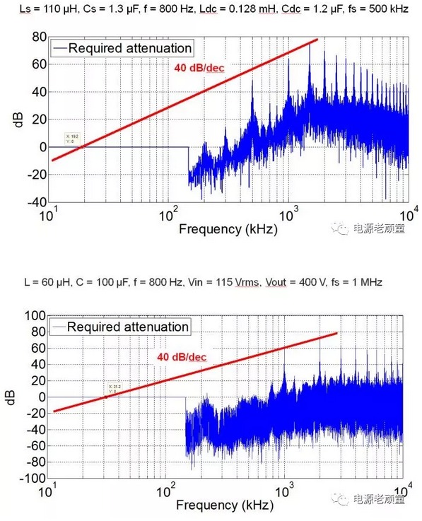 我知道很多人開始噴我了,怎么可能,di/dt和dv/dt都大了,怎么可能EMI濾波體積還小了。我想說一句,共模和差模濾波器的沒有區別,相同的截止頻率下,高頻的衰減更大!就算你高頻下共模噪聲越大,但是你的記住,這個頻率下LC濾波器的衰減更大,想想幅頻曲線吧。為了說明這個結論,我給出一些定量分析結果。這些EMI分析均基于AC/DC三相整流,拓撲為維也納整流。我分別給出了1Mhz和500Khz的共模噪聲,可以看出,500khz共模濾波器需要的截止頻率為19.2kHz,1MHz為31.2kHz。
