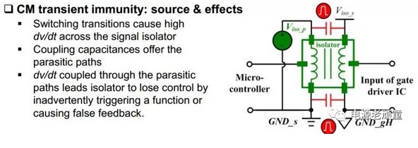 同時選隔離芯片的時候也需要注意一個參數叫做CM transient immunity(肯定會給的),這個參數較好大于開關瞬間,橋臂中點電平的變化速率。光耦隔離這個參數一般在30kV/us,磁耦在35kV/us,電容耦合在50kV/us(是不是絕望了,都比氮化鎵低,硅器件一般在10kV/us,Sic 30kV/us)。