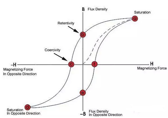 增加磁芯的磁導率,可以提高電感值,通常使用鐵磁性材料做磁芯。鐵磁性材料存在磁飽和現象,即當磁場強度超過一定值時,磁感應強度不在增加,即磁導率下降了,也就是電感下降了。在額定電感值范圍內,允許的較大電流即為飽和電流。