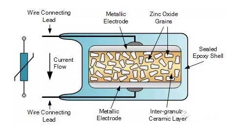 電源適配器壓敏電阻通常都是金屬氧化物可變電阻,即Metal Oxide Varistor(MOV),其電阻材料是氧化鋅顆粒和陶瓷顆粒混合后一起燒結成型。MOV的特性就是當電壓超過一定閾值的時候,電阻迅速下降,可以通過大電流,因此可以用于浪涌防護和過壓保護。