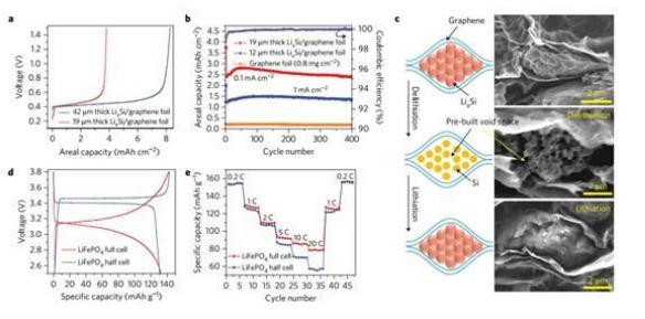圖四, 硅鋰合金-石墨烯柔性電極的電化學性能。 (Nature Nanotech., 2017, 12, 993–999) 文章轉載自網絡,如有侵權,請聯系刪除。 |