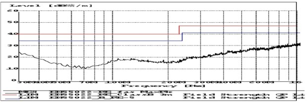 排除外界因素 - 將被測(cè)設(shè)備關(guān)電, 確認(rèn)背景噪聲是否滿足標(biāo)準(zhǔn)要求 (標(biāo)準(zhǔn)要求電波暗室的背景噪聲在限值線以下6dB) 。
