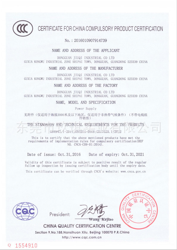 網站首頁 » 產品展示 » 產品認證 » 36W證書 » CCC安規證書-36W系列電源適配器