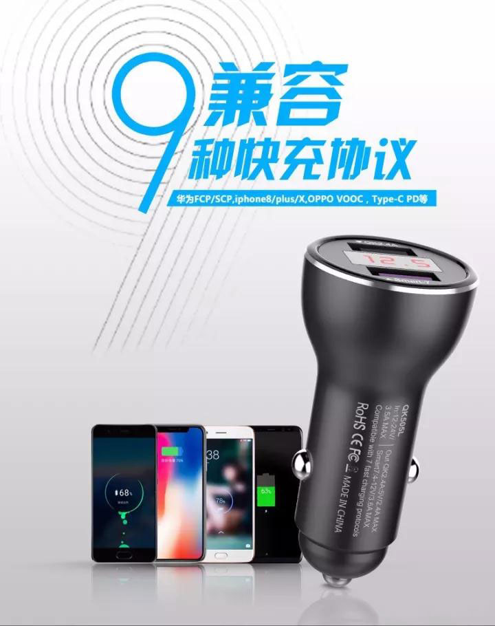 最新專利高品質(zhì)車載充電器兼容 華為P9/10 MATE 9/10超級快充 OPPIO VOOC閃充及QC3.0/2.0等9種充電協(xié)議的安卓系統(tǒng)全功能快充的車載充電器。其中型號QK518C Type-C接口版實現(xiàn)IPHONE8/X PD快速充電。