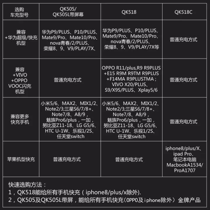 通俗適用性:QK505/QK505L支持給任何手機充電的同時,如果手機支持快速充電功能它就支持給手機快速充電,但OPPO,VIVO,iphone8/PLUS/X除外。