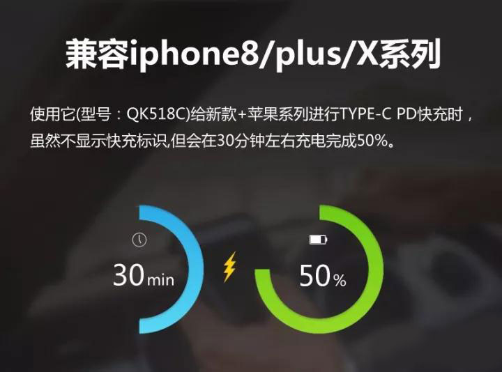 通俗適用性:QK518支持給任何手機充電的同時,如果手機支持快速充電功能它還支持給手機快速充電,但iphone8/PLUS/X除外。